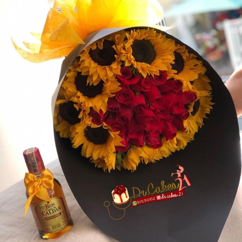 12 preciosos Girasoles  1 botella Pequeña de Ron Caldas